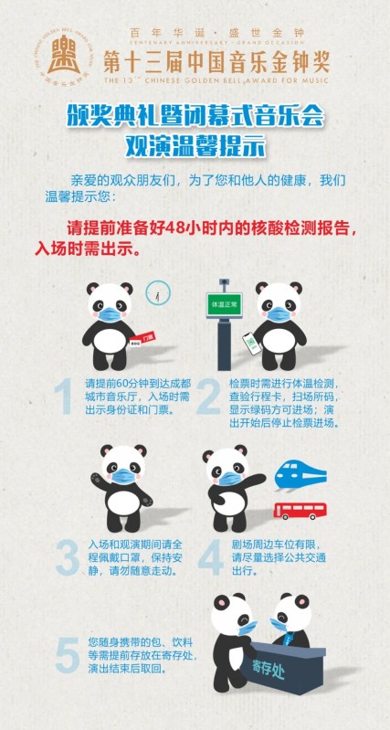 “按照最新的要求,观众在入场时除了测量体温、查验行程卡、出示健康码之外,今晚的演出还需要出示48小时内的核酸检测报告,如果观众无法提供报告,平台会接受退票处理。”成都城市音乐厅相关工作人员向记者表示,今晚将要在城市音乐厅举行的第十三届中国音乐金钟奖颁奖典礼暨闭幕式音乐会,就将执行这一最新规定。