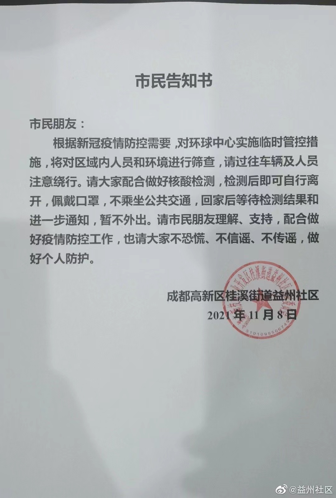11月8日18时33分,成都高新区桂溪街道益州社区发布市民告知书,根据新冠疫情防控需要,对环球中心实施临时管控措施,将对区域内人员和环境进行筛查。请大家配合做好核酸检测,检测后即可自行离开,佩戴口罩,不乘坐公共交通,回家后等待检测结果和进一步通知,暂不外出。