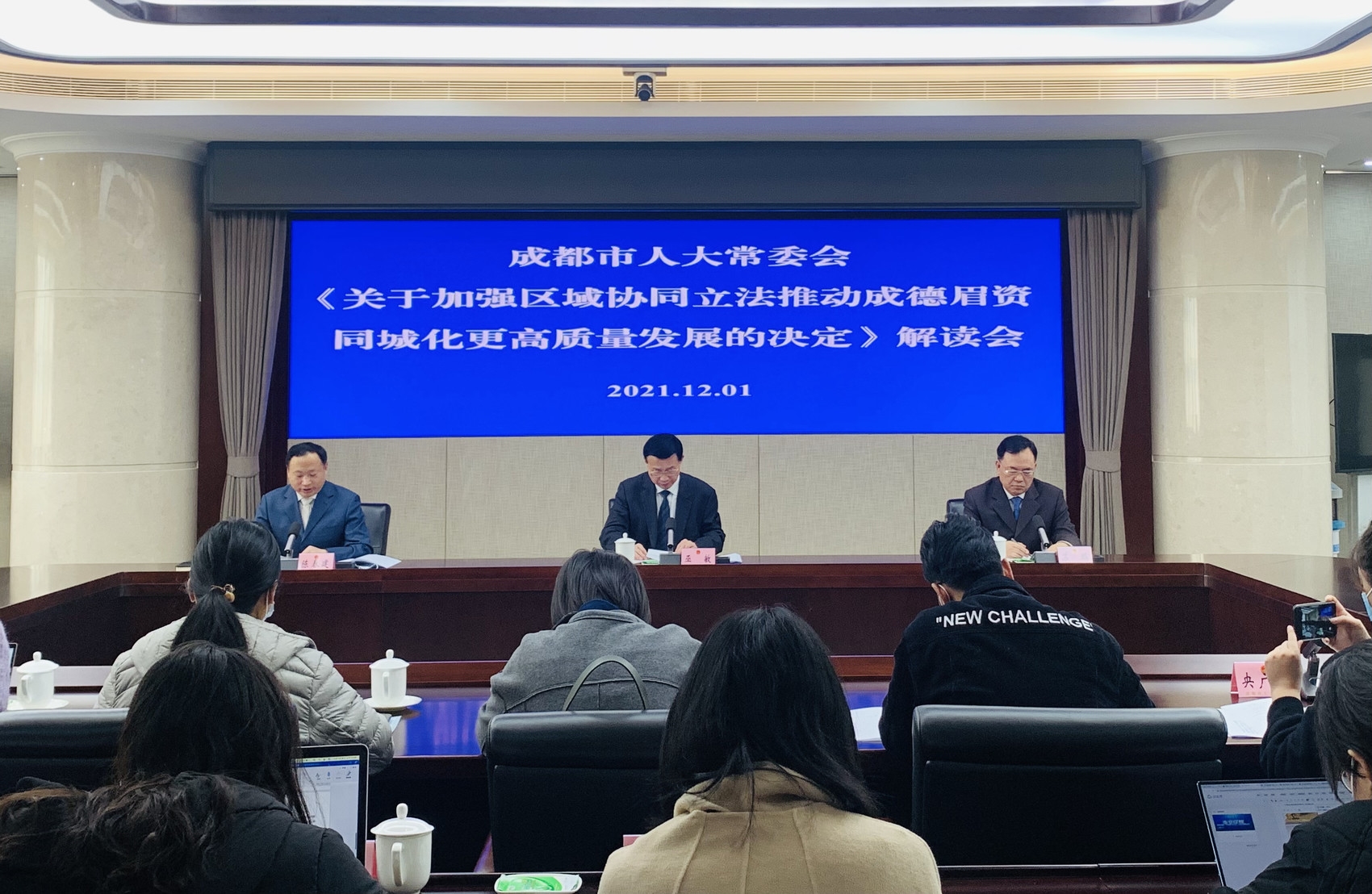 时间:2021-12-02 13:17:30 来源:四川在线12月1日,成都市第十七届人大常委会第三十一次会议表决通过了《成都市人民代表大会常务委员会关于加强区域协同立法推动成德眉资同城化更高质量发展的决定》(以下简称《决定》)。随后,成都市人大常委会召开《决定》解读会,详细解读《决定》的背景意义、实践基础和特色亮点。