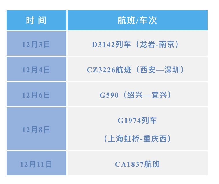 搭乘过以下交通工具的来(返)川人员,第一时间主动向社区或居(村)委会、单位或入住酒店报备旅居史,配合做好相关防控工作。