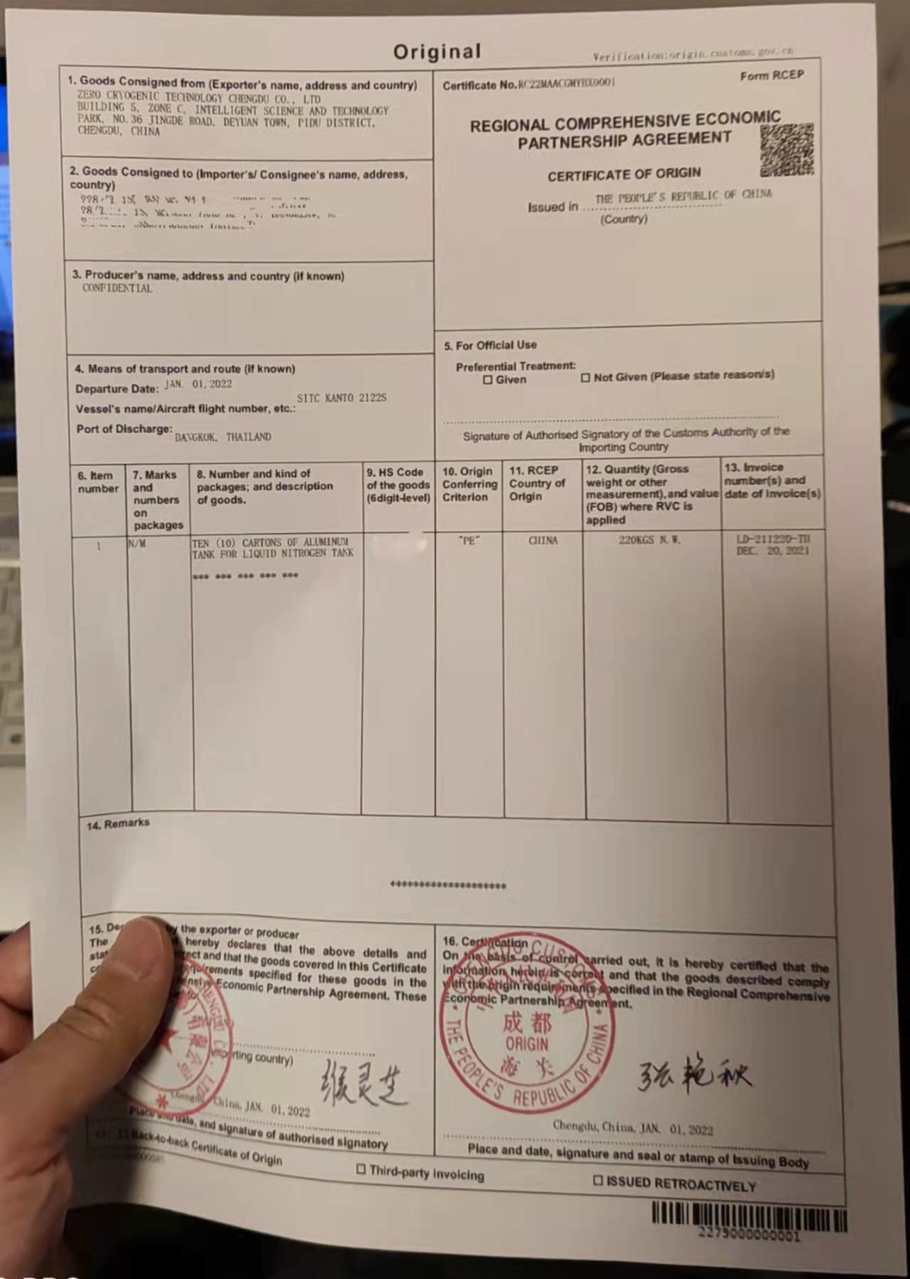 比四川富民化工有限公司动作快一步,就在1月1日零时10分,零度低温科技(成都)有限公司出口泰国的一批铝制罐,已经通过网上渠道在成都海关所属锦城海关申领到了RCEP原产地证书,这也四川落地的首份RCEP原产地证书。