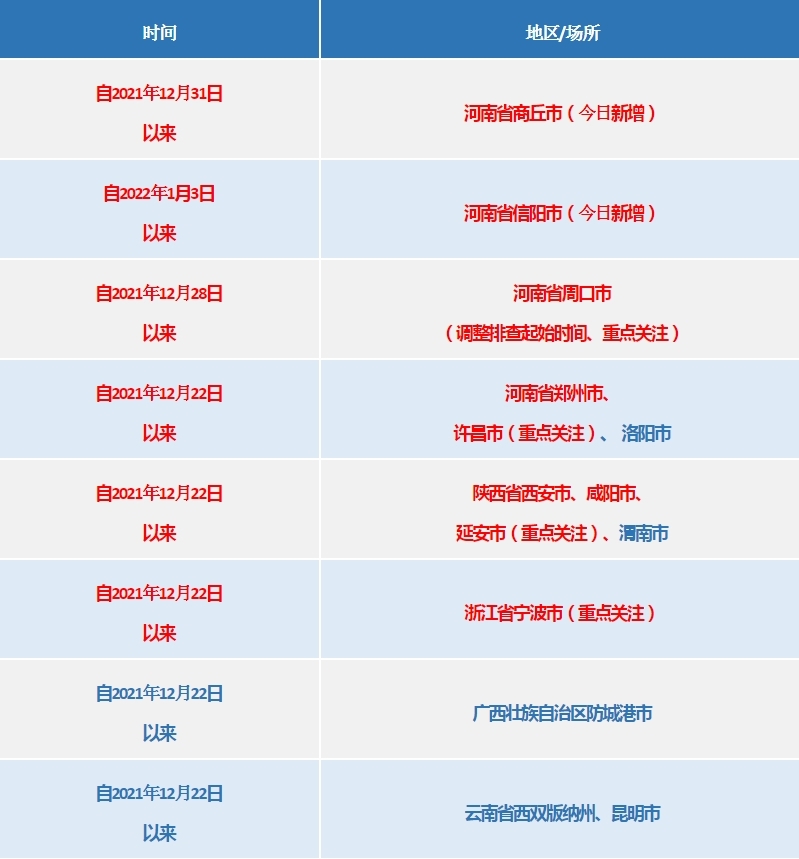 随时关注国内新冠肺炎疫情变化情况,近期重点关注河南省郑州市、许昌市、周口市、洛阳市新安县,陕西省西安市、咸阳市、延安市,浙江省宁波市疫情,不前往高、中风险地区以及发生本土疫情的地区。如您近期有疫情地区旅居史,收到提醒短信或健康码变为“黄码”,请立即向所在社区(村)、单位或入住酒店报备旅居史,按要求做好核酸检测,配合做好隔离管控措施。