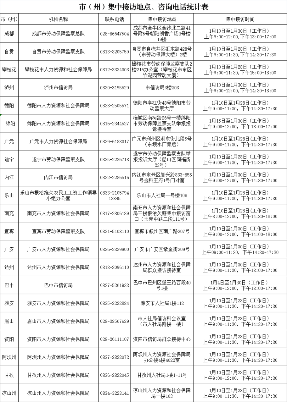 为深入推进“我为群众办实事”活动,进一步畅通举报投诉渠道,压实各地各有关部门责任,切实做好春节前保障农民工工资支付工作。从1月10日起,四川省开展拖欠农民工工资举报投诉集中接访活动启动。省级层面,省根治拖欠农民工工资工作领导小组办公室组织人力资源和社会保障厅、住房和城乡建设厅等10家成员单位有关负责人集中接访问,各市(州)也同步开展集中接访活动。
