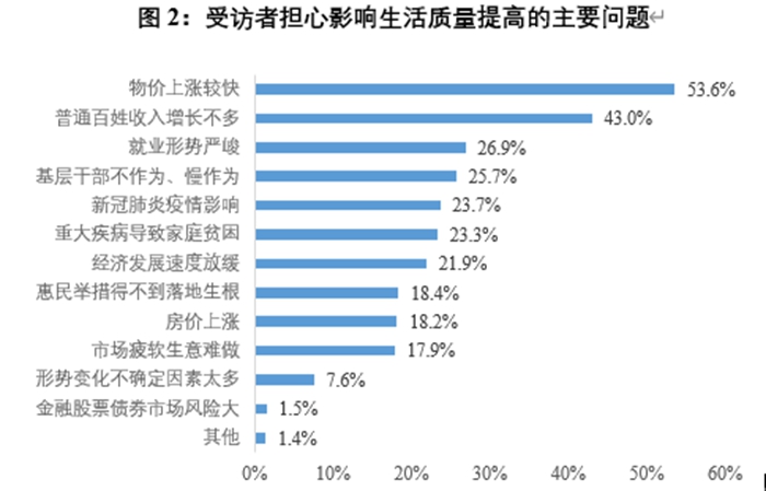 当问及受访者2022年最担心影响生活提高的主要问题时,选择“物价上涨较快”的比例最高,为53.6%;其次是“普通百姓收入增长不多”,为43.0%。
