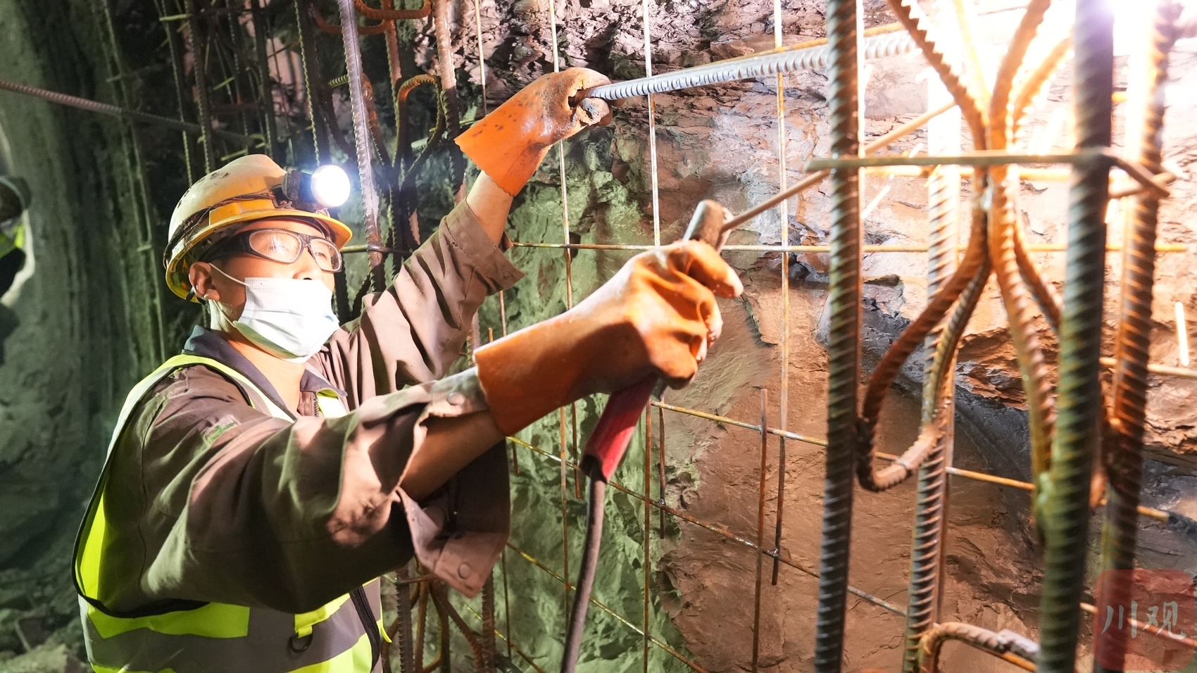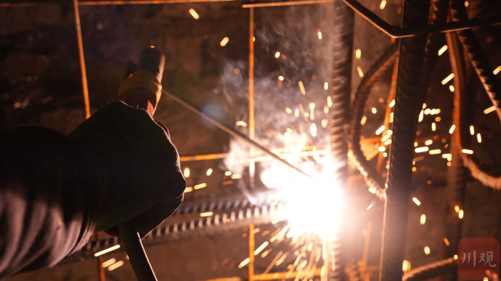 说话间,一辆挖掘机搭载着弧形的连接筋前来,几名工人上前抬起连接筋,放置到台车底部。台车顶部,在技术人员的指导下,连接筋拼接成型,电焊工开始工作,火花从高处滚落,分外好看。身穿红色制服的瓦检员赵德裕站在旁边,一直监测记录着异常气体的数值。
