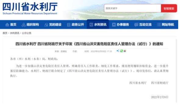 时间:2022-02-12 07:58:39 来源:川观新闻2月11日,江粉儿从四川省水利厅获悉,近日水利厅、财政厅联合印发了《四川省山洪灾害危险区责任人管理办法(试行)》(以下简称《办法》)。