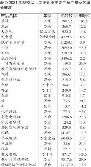 从主要产品产量看,原煤产量比上年下降10.2%,汽油增长12.2%,发电量增长6.5%,天然气增长14.6%,铁矿石原矿量增长3.9%,电力电缆增长145.6%,电子计算机整机增长29.0%,啤酒增长14.7%,汽车增长11.3%,白酒增长3.7%,成品钢材增长2.2%。全年规模以上工业企业产销率为97.6%。