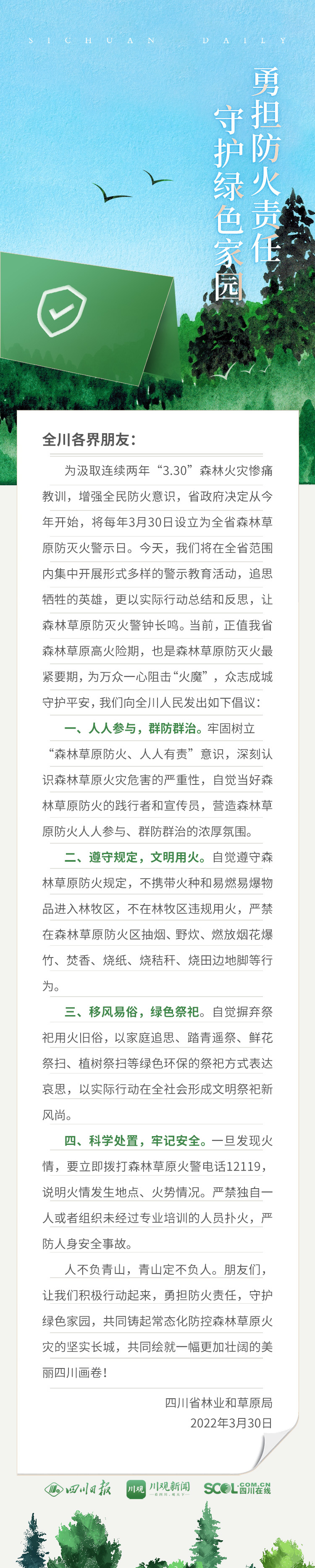 时间:2022-03-31 15:52:17 来源:川观新闻为汲取连续两年“3.30”森林火灾惨痛教训,增强全民防火意识,省政府决定从今年开始,将每年3月30日设立为全省森林草原防灭火警示日。