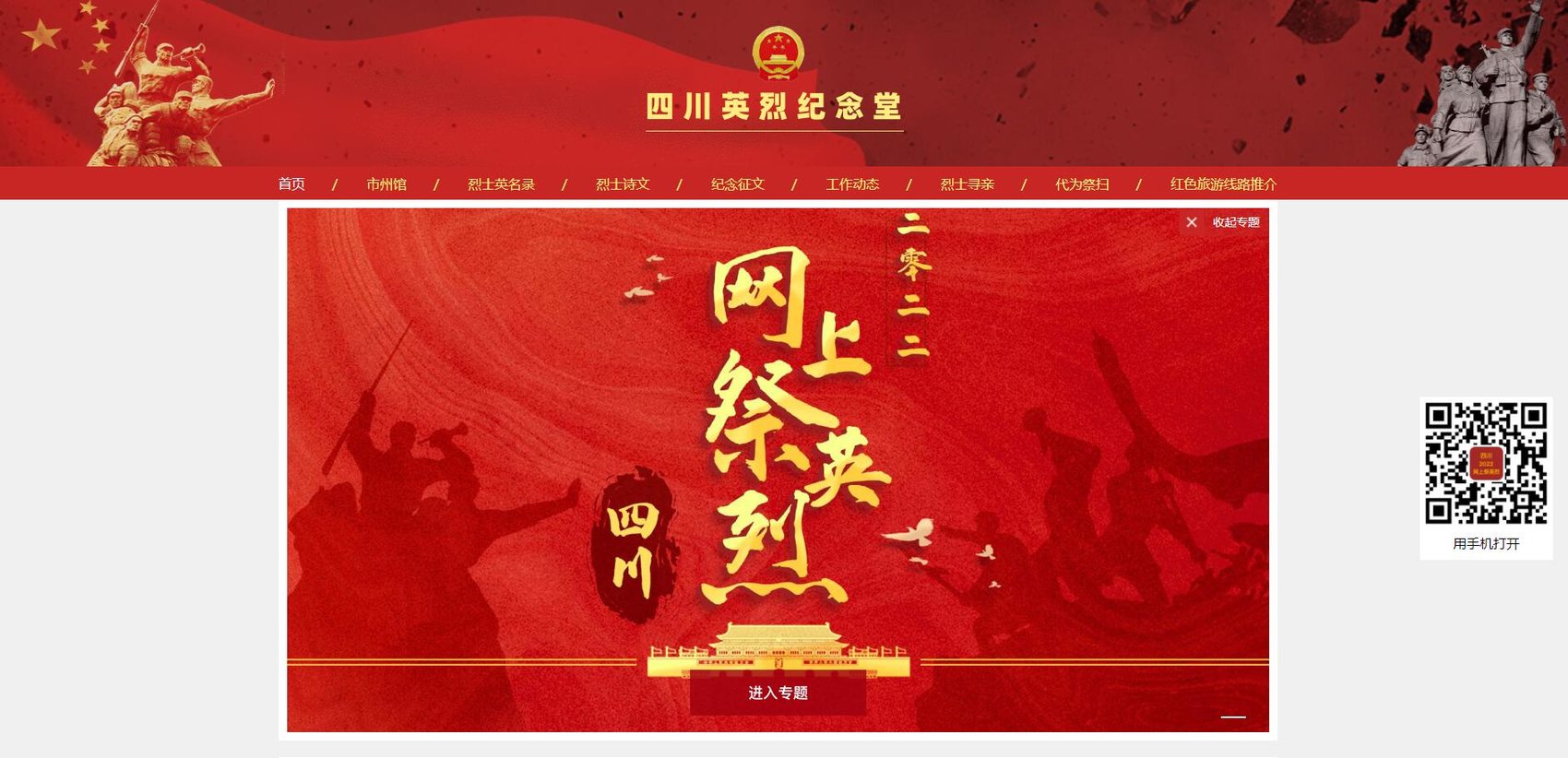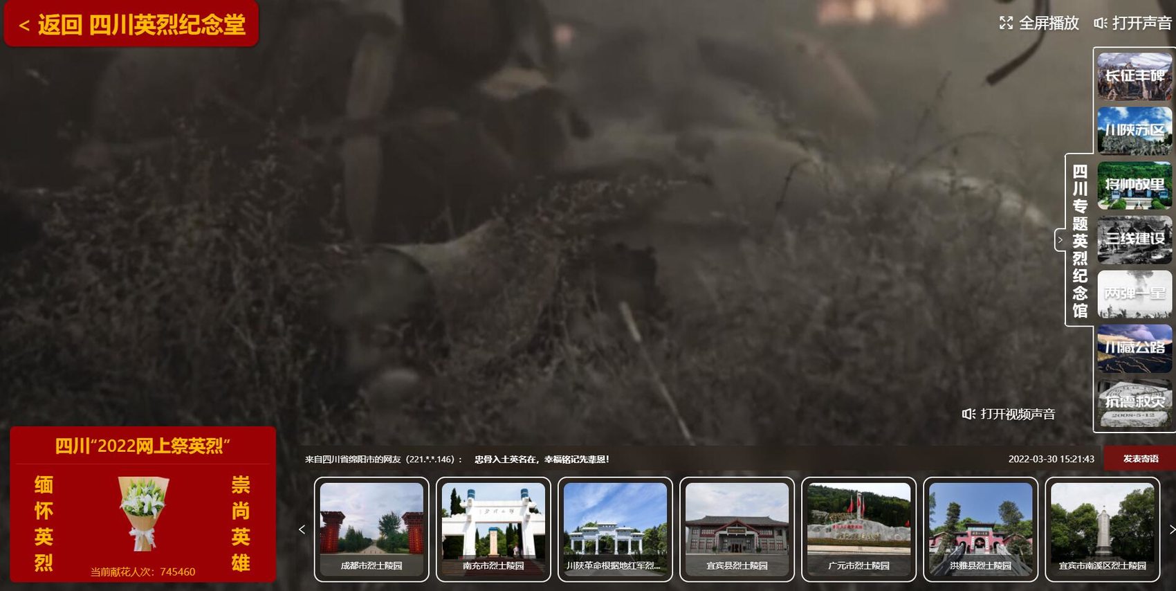 据悉,为了进一步引导干部群众通过网站寄托哀思、缅怀英烈,在去年改版上线基础上,各级退役军人事务部门和烈士纪念设施保护单位,对四川英烈纪念堂中烈士纪念设施和英烈信息不断进行增补完善,四川烈士英名录在去年收录4万余名英烈信息的基础上,增补收录至13万余名。今年,还上线“2022网上祭英烈”主题活动专栏,使四川英烈纪念堂网上祭扫、英烈缅怀主阵地的作用更加凸显,功能更加完善,推动形成“云祭扫”新风尚,在全社会营造起崇尚英烈、缅怀英烈、学习英烈、捍卫英烈的浓厚氛围。