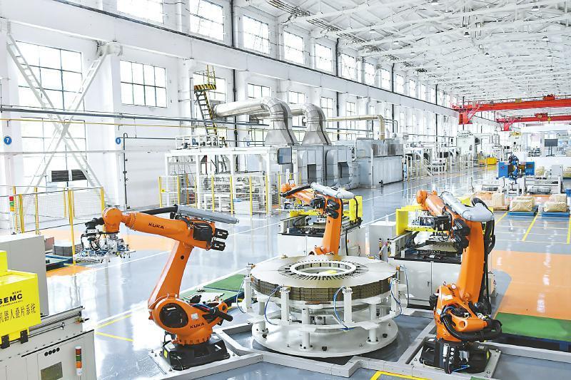 东方电机定子冲片数字化车间内,正在进行定子冲片生产。 东方电机供图