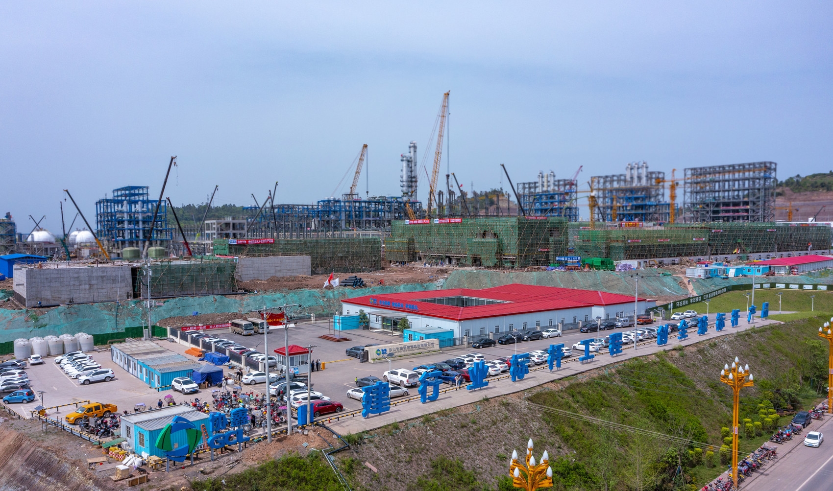 这是2022年乐山“中国绿色硅谷”首个正式投运的变电站。有了电力保障,乐山协鑫(一期)年产10万吨颗粒硅项目建设按下快进键。春阳下,厂区内数千名工人正加紧进行土建、钢结构、电气仪表、设备安装等施工作业。