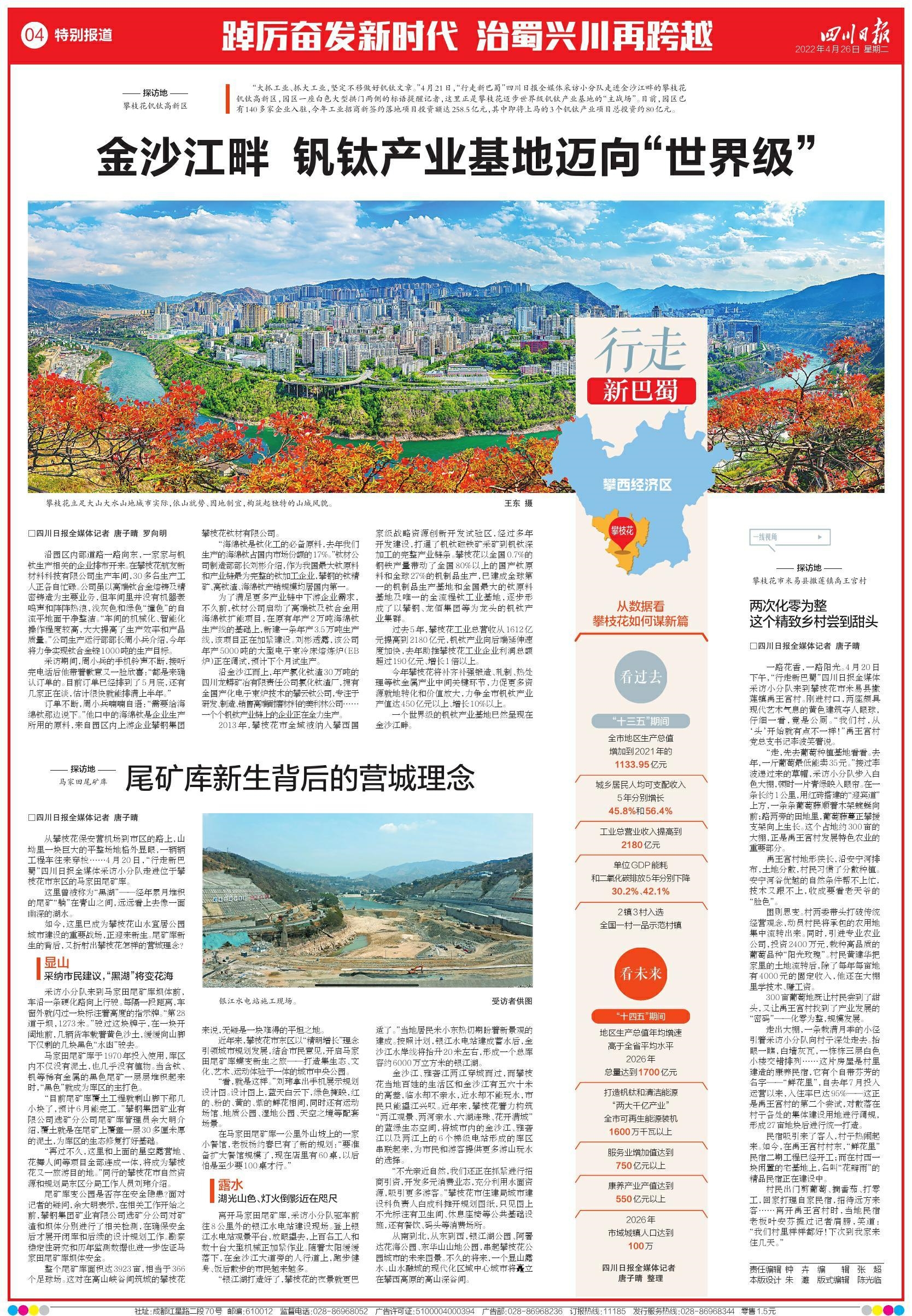 时间:2022-04-26 15:35:08 来源:四川在线“行走新巴蜀”21市州巡礼报道 今日聚焦攀枝花 金沙江畔 钒钛产业基地迈向“世界级” 攀枝花立足大山大水山地城市实际,依山就势、因地制宜,构筑起独特的山城风貌。 “大抓工业、抓大工业,坚定不移做好钒钛文章。”4月21日,“行走新巴蜀”四川日报全媒体采访小分队走进金沙江畔的攀枝花钒钛高新区,园区一座白色大型拱门两侧的标语提醒记者,这里正是攀枝花迈步世界级钒钛产业基地的“主战场”。目前,园区已有140多家企业入驻,今年工业招商新签约落地项目投资额达258.5亿元,其中即将上马的3个钒钛产业项目总投资约80亿元。 详情: 尾矿库新生背后的营城理念 银江水电站施工现场。受访者供图。 从攀枝花保安营机场到市区的路上,山坳里一块巨大的平整场地格外显眼,一辆辆工程车往来穿梭……4月20日,“行走新巴蜀”四川日报全媒体采访小分队走进位于攀枝花市东区的马家田尾矿库。 这里曾被称为“黑湖”——经年累月堆积的尾矿“躺”在青山之间,远远看上去像一面幽深的湖水。 如今,这里已成为攀枝花山水宜居公园城市建设的重要战场,正迎来新生。尾矿库新生的背后,又折射出攀枝花怎样的营城理念? 详情: 两次化零为整 这个精致乡村尝到甜头 禹王宫村里的葡萄种植大棚。 一路花香,一路阳光,4月的攀枝花不仅鲜花盛放,还多了股毫不遮掩的热情。“行走新巴蜀”四川日报全媒体采访小分队走进攀枝花市米易县撒莲镇禹王宫村,刚拐进村口,两个颇具现代艺术气息的黄色建筑物映入眼帘。 仔细一看,原来是座公厕。 “我们村,从‘头’就有点不一样!” 禹王宫村党总支书记李波笑呵呵地说。 “走,先去我们村的葡萄种植基地看看,去年一斤最低能卖35元。”接过李波递过来的草帽,我们从村口往左走,步入白色大棚,一片青绿涌入眼中。 详情: 行走新巴蜀·攀枝花③ | 两次化零为整 这个精致乡村尝到甜头 种下第一棵芒果树的混撒拉村 还在做“新试验” 混撒拉村省五星级芒果现代农业园区全景。 4月21日,“行走新巴蜀”四川日报全媒体采访小分队走进攀枝花市仁和区大龙潭乡混撒拉村。这个村是攀枝花芒果的“发源地”,不仅最先试种芒果找准了发展的方向,还闯出村民致富的路子。这场已经持续了30多年的试验,还在继续。 走进混撒拉村,映入眼帘的是漫山遍野的芒果林,有的芒果树已长出果子,大部分花朵盛放。在一片青翠的果林里,记者寻见了老村支书李德的身影,混撒拉的第一棵芒果树正是他在34年前栽下。 详情: 行走新巴蜀·攀枝花④ | 种下第一棵芒果树的混撒拉村 还在做“新试验” 30秒看阳光洒满攀枝花 两江春水穿城过,座座青山入眼来。4月行走攀枝花,阳光总是炙热,阴雨总是短暂。 这座金沙江畔的城市有着怎样的英雄历史,已经不必多言。但它将迎来怎样的未来?我们在行走中,逐渐得到了答案。 戳视频: