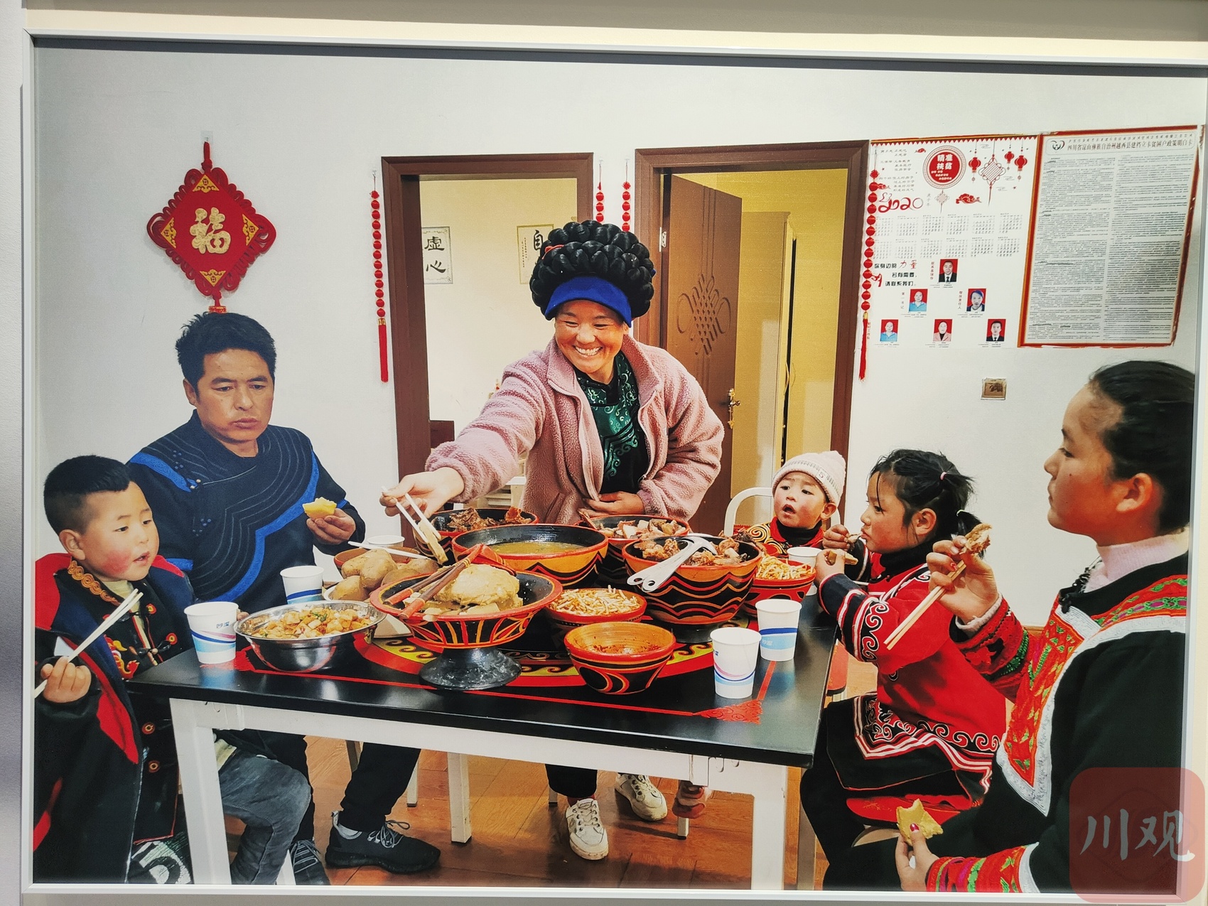 在一楼展厅转角处,是火普村村民吉地尔子一家的新居场景。该场景还原了他家厨房的情况,挂满了腊肉、香肠,锅里有刚蒸上的腊肉、香肠、土豆和荞馍馍。马天告诉记者,火普村是易地扶贫搬迁的彝家新村,2018年实现整村脱贫退出,群众住上了新房子,生活条件得到了很大改善。