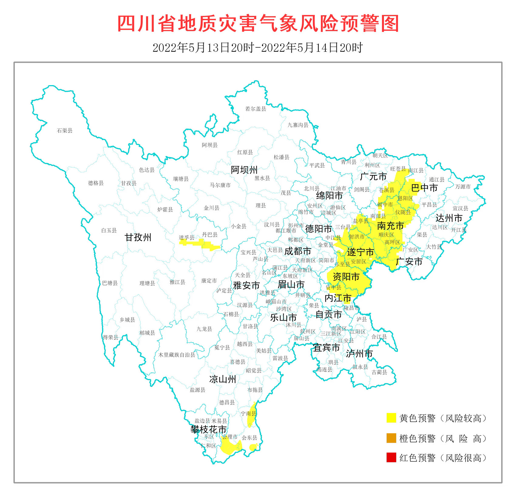 时间:2022-05-13 19:11:25 来源:川观新闻5月13日17时,四川省地质灾害指挥部办公室发布地质灾害气象风险3级黄色预警,涉及11市(州)36个县(市、区)。