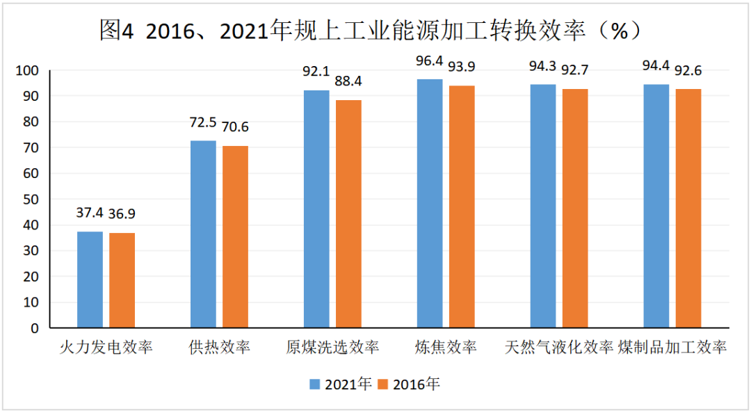 能源加工转换效率普遍提高。和2016年相比,规上工业原煤洗选效率达到92.1%,提高3.7个百分点;炼焦达到96.4%,提高2.5个百分点;供热达到72.5%,提高1.9个百分点;煤制品加工达到94.4%,提高1.8个百分点;天然气液化达到94.3%,提高1.6个百分点;火力发电达到37.4%,提高0.5个百分点。