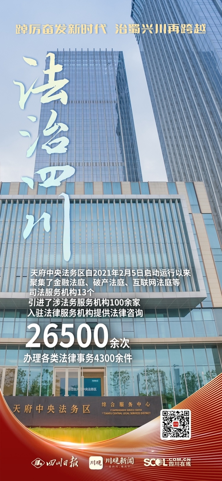 天府中央法务区是全国首个省级层面主导建设的现代法务集聚区。去年2月5日正式启动运行以来,已吸引涉法服务机构100余家;最高人民法院第五巡回法庭成都审判点等司法资源也在此布局。“四川用改革思维和创新办法建设天府中央法务区”被推荐为“中国改革2021年度特别案例”。