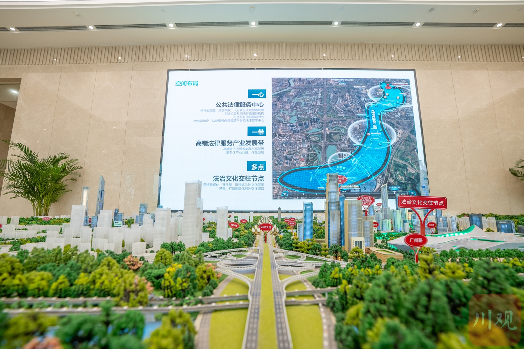 记者站在综合服务中心用于展示规划的沙盘前,一个具有公共法律服务中心、高端法律服务产业发展带以及多个法治文化节点的“天府中央法务区”映入眼帘。记者发现,沙盘东边和东北方向的建筑比其他区域密集,且呈现出沿着成都地铁6号线分布的特点。“建筑最密集的部分是商务区,沿着地铁6号线分布的是法律服务产业发展带,从规划到落地,商务区和法务区的建设都是同步运行的。”顾涛介绍,目前商务区已经签约了重大产业项目102个,总投资超2500亿元。