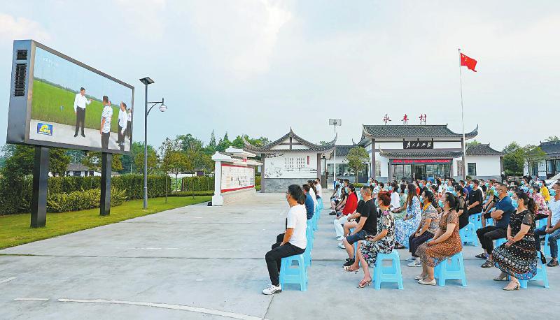 6月9日晚,眉山市东坡区太和镇永丰村干部群众一起收看中央广播电视总台新闻联播播出的习近平总书记来川考察的新闻报道。记者 吴聃 摄