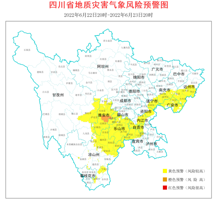 时间:2022-06-22 18:30:40 来源:四川观察根据四川省地质环境条件,结合四川省气象台天气预报情况,四川省地质灾害指挥部办公室发布全省地质灾害气象风险预警(6月22日20时至6月23日20时),本次预警最高级别为2级,橙色预警,另有78个县市区3级,黄色预警。结果如下: