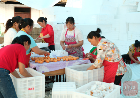 村民们在五龙乡的冷山合作社包装枇杷。每3人一组,选果、分果、套袋、装盒、包装,流水线作业适应线上销售模式。 川观新闻记者 郝飞/摄