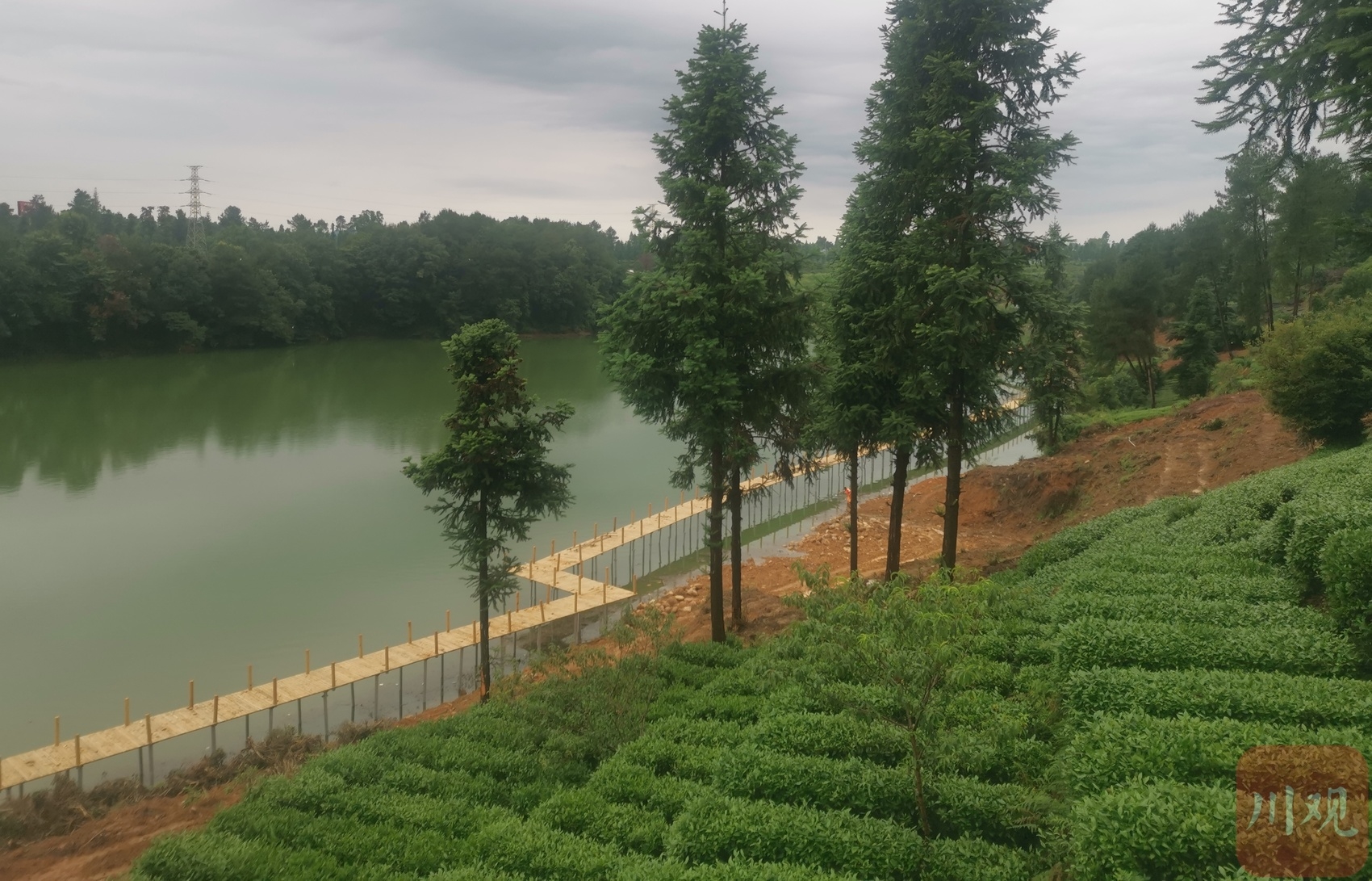 雅安市解放村月亮湖正在进行亲水栈道的施工。
