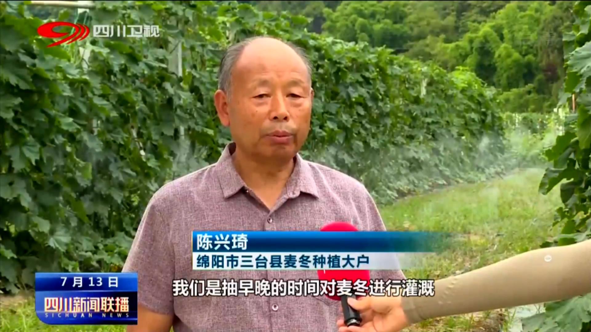 绵阳市三台县麦冬种植大户 陈兴琦:天气很炎热,我们是抽早晚时间对麦冬进行灌溉,为了保证麦冬的正常生长,我们套种了玉米和蔬菜,这样可以给麦冬遮阴。