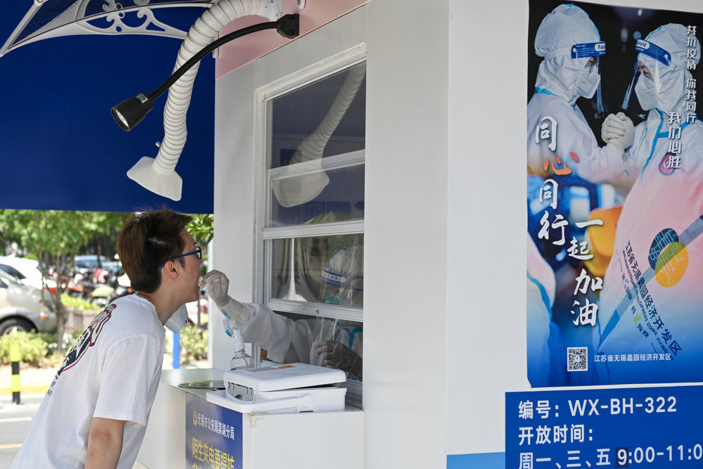 7月5日,在无锡市滨湖区蠡园街道的一处核酸采样点,一名市民在进行核酸采样。