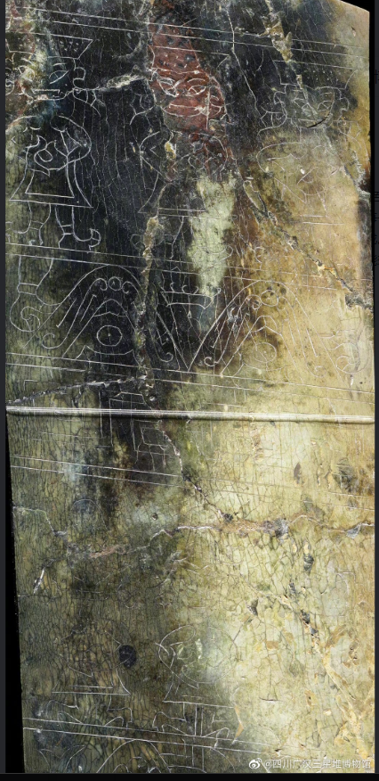 这件玉璋图案是古蜀玉器中的珍品,是迄今为止、所见最早的一幅玉器上的线刻绘画,是殷商考古和其他区域文明考古从未发现过的,它显示出了极为丰富的内涵。这些图案既有对人间社会与天地自然的如实描绘,如部族中妇人的服饰、作为生产基地的山峦,更有对神灵世界的奇异想象,如图腾的崇拜,对日、月、星的崇拜等。图案画面的排列组合,以及由线条纹饰构成的图案布局,也同样具有丰富的含义,充分展示了古蜀美术家丰富的想象力和高超的技艺,从中可窥知古蜀绘画艺术的水平和特色,弥足珍贵。