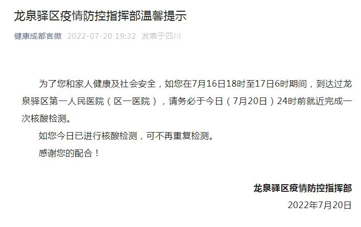 为了您和家人健康及社会安全,如您在7月16日18时至17日6时期间,到达过龙泉驿区第一人民医院(区一医院),请务必于今日(7月20日)24时前就近完成一次核酸检测。