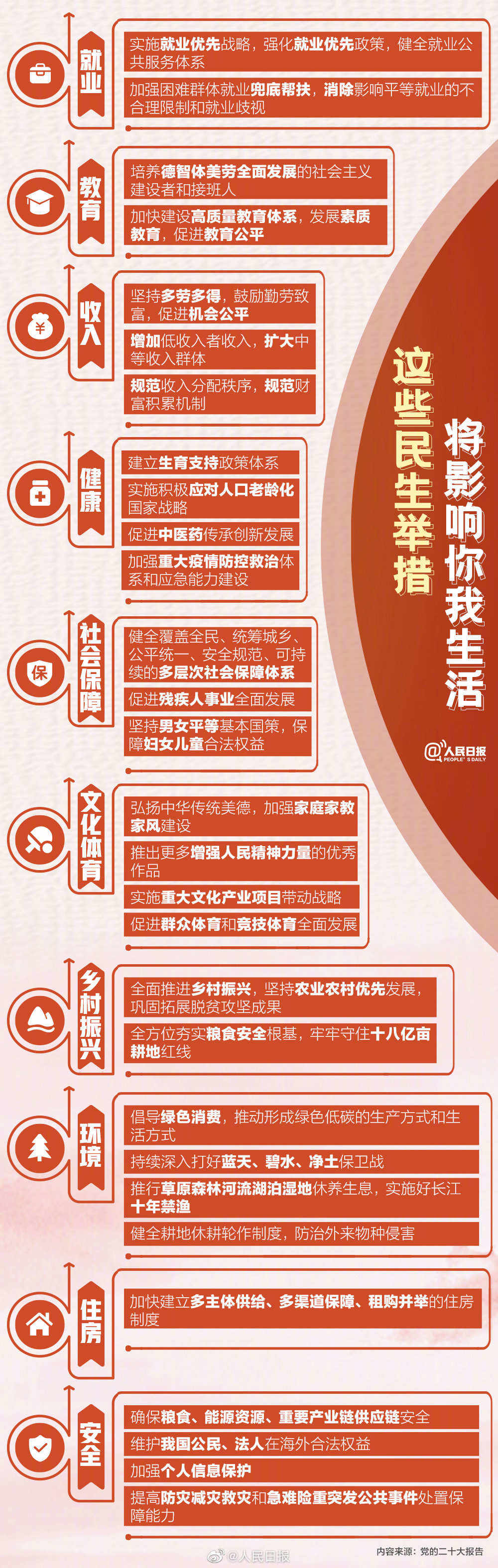 党的二十大报告指出,必须坚持在发展中保障和改善民生,鼓励共同奋斗创造美好生活,不断实现人民对美好生活的向往。就业、教育、收入、健康……你关心的这些民生问题,党的二十大报告里都有提及。一图了解二十大报告中的民生举措!