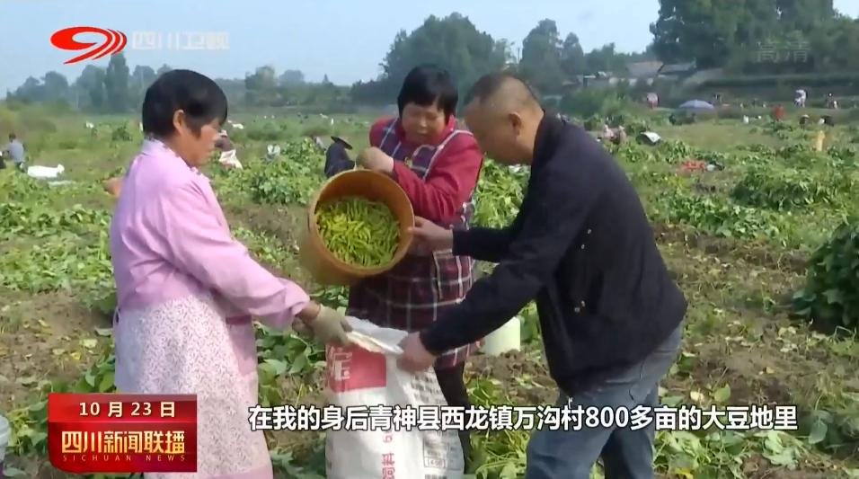 记者 陈梦颖:在我的身后,青神县西龙镇万沟村800多亩的大豆地里一派繁忙的景象,村民们抢抓有利的天气,确保应收尽收、颗粒归仓。