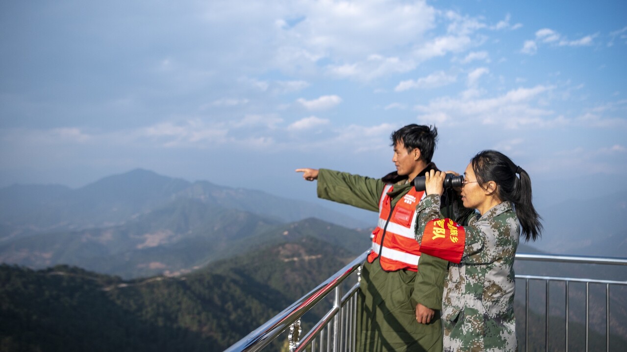 护林员在瞭望塔实时监控火情。