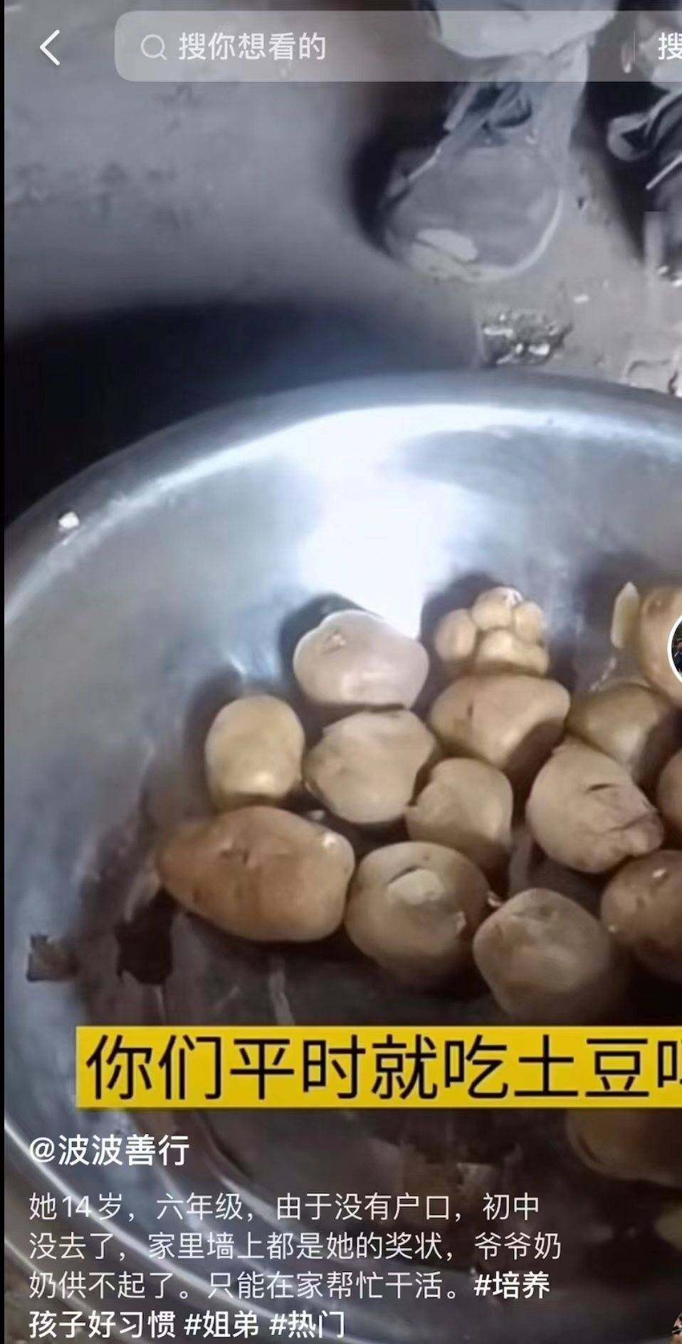 在某视频平台上,“云南波波”还曾发布过马鞍山乡一对姐弟的视频。视频中,姐弟两人每天上山背柴,平时只能吃土豆,而且姐姐因为没有户口,虽然成绩很好,但只能在家中放羊,让评论区中不少网友直呼“太可怜”。