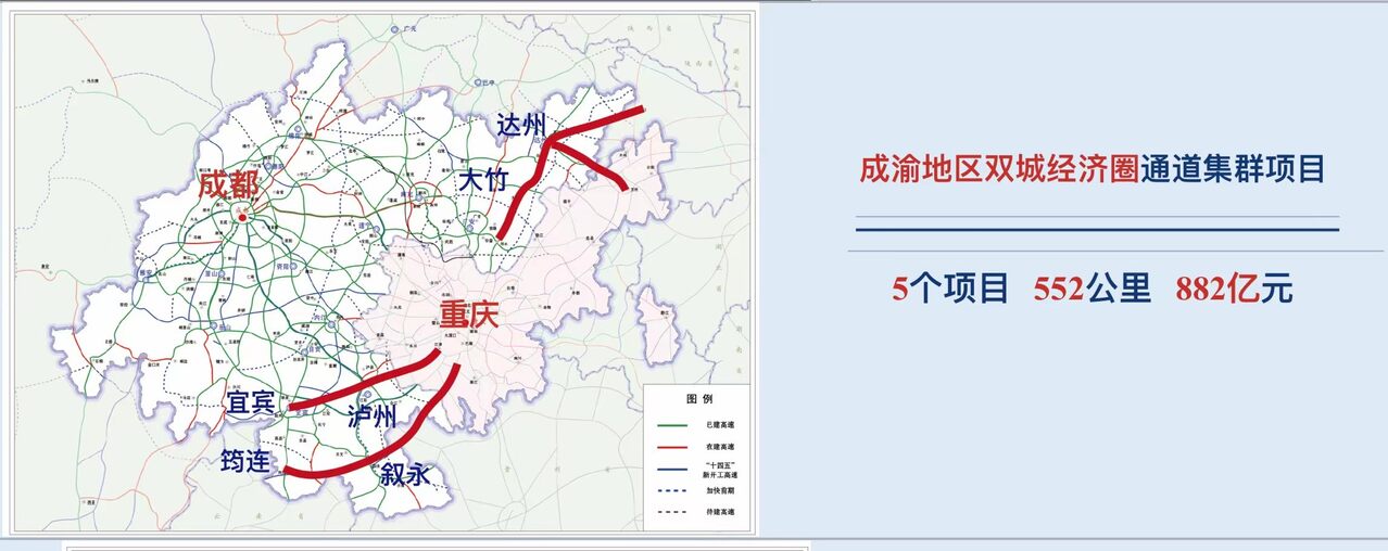 目前,川渝两地规划的36条省际高速公路通道已建成14条、在建4条、待建18条。其中,成渝扩容、遂渝扩容、大竹至垫江、自贡至永川4个项目,去年已招商成功。而本次大会则亮相了重庆经叙永至筠连泸州段、宜宾段、江津经泸州至宜宾、达州至万州、城口经宣汉至大竹至邻水,共五个项目,将有效服务川南渝西一体化和万达开川渝统筹发展示范区建设。