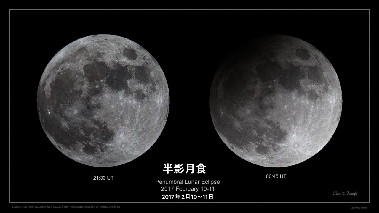 与本影月食,也就是月全食和月偏食的月亮有明显缺失不同的是,发生“半影月食”时,肉眼看去月亮依旧是圆的,且照样是亮的,只是亮度稍暗。在半影月食期间,投射在月面的阳光被地球遮住了一部分,月面上的高山峡谷和带有辐射纹的陨石坑会显得更为清楚。