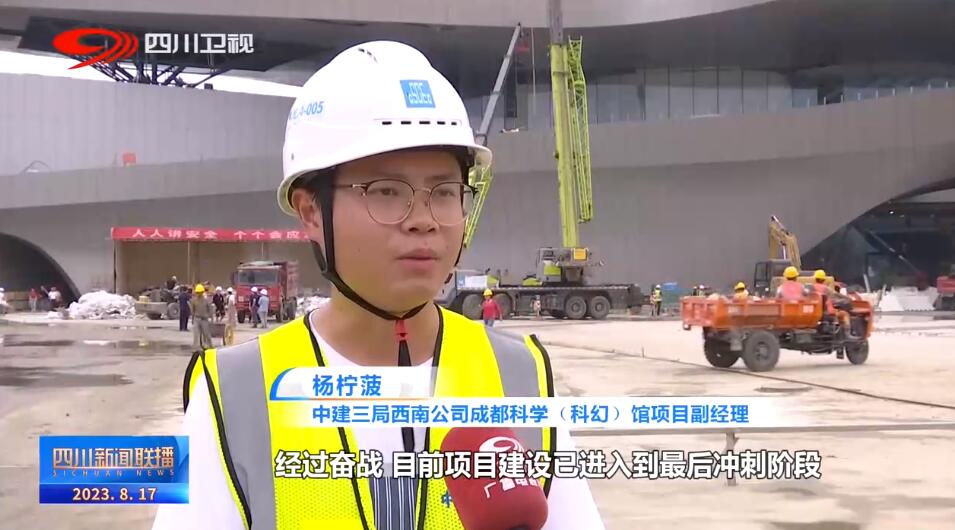 中建三局西南公司成都科学(科幻)馆项目副经理 杨柠菠:经过奋战,目前项目建设已进入到最后冲刺阶段,正在进行装饰、机电安装调试施工,将于8月底完成,2023世界科幻大会是成都举办的又一项世界级盛会,我们有信心尽快让大会的主场馆以一个最完美的状态与大家见面。