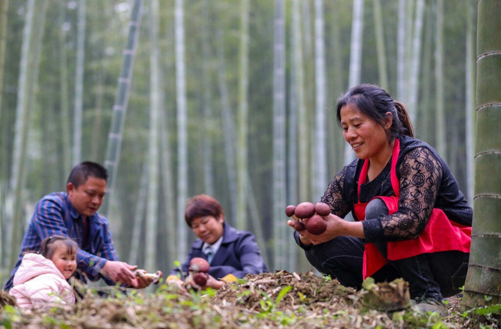 宜宾市长宁县梅硐镇泽鸿村,当地村民正在竹林里采收新鲜的蘑菇。庄歌尔 摄