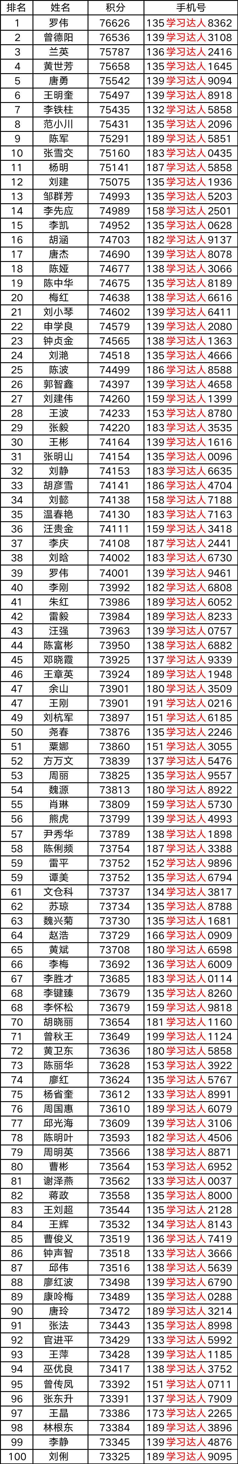 内江市首届我在“学习强国”,我做“学习达人”评选活动正在进行,现已产生2023年5月“‘晒’积分达人榜”排名前100达人,经平台复核,公布名单如下: