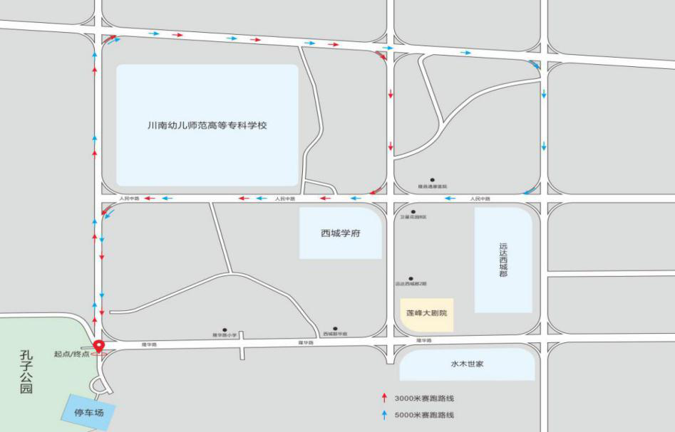 5000米比赛路线:从孔子公园停车场出发—环城西路—向阳路(川南幼专背后)—中山路—人民中路(经通康医院、川南幼专正门)—环城西路—孔子公园停车场。
